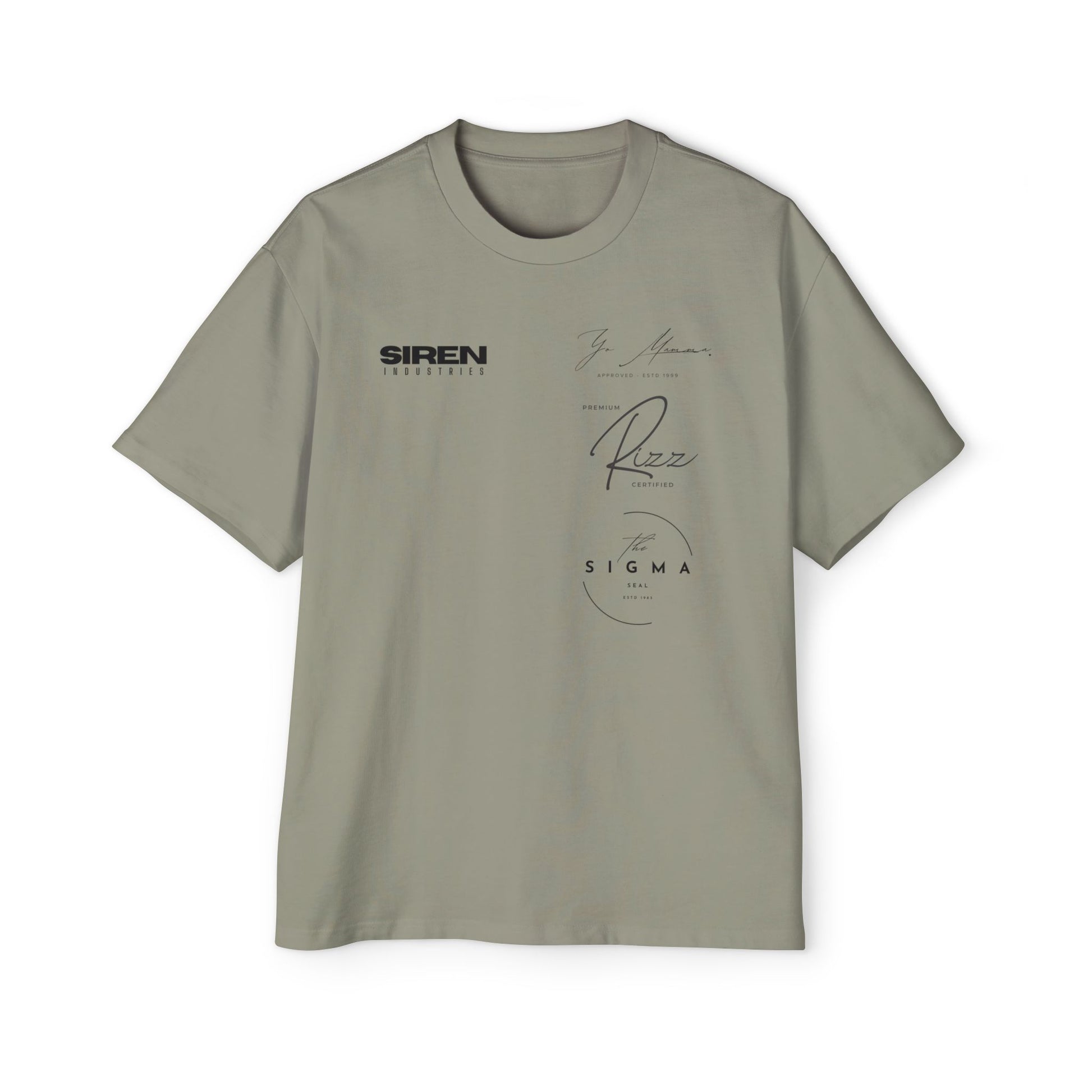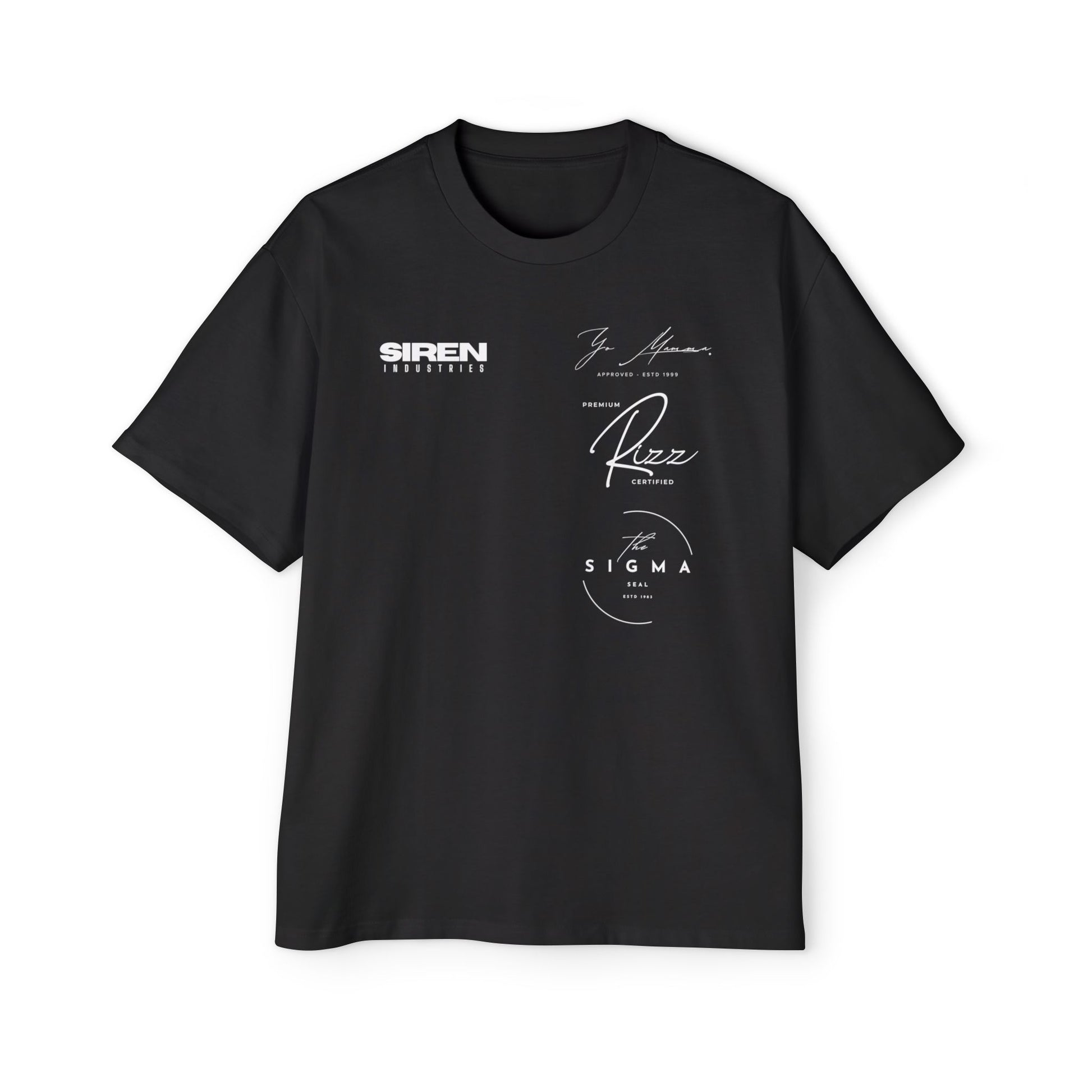 This quality oversized tee has triple bold statements printed; Yo Mamma approved 1999, Premium Rizz Certified and the Sigma Seal 1983. Increase your confidence level and become that icon.